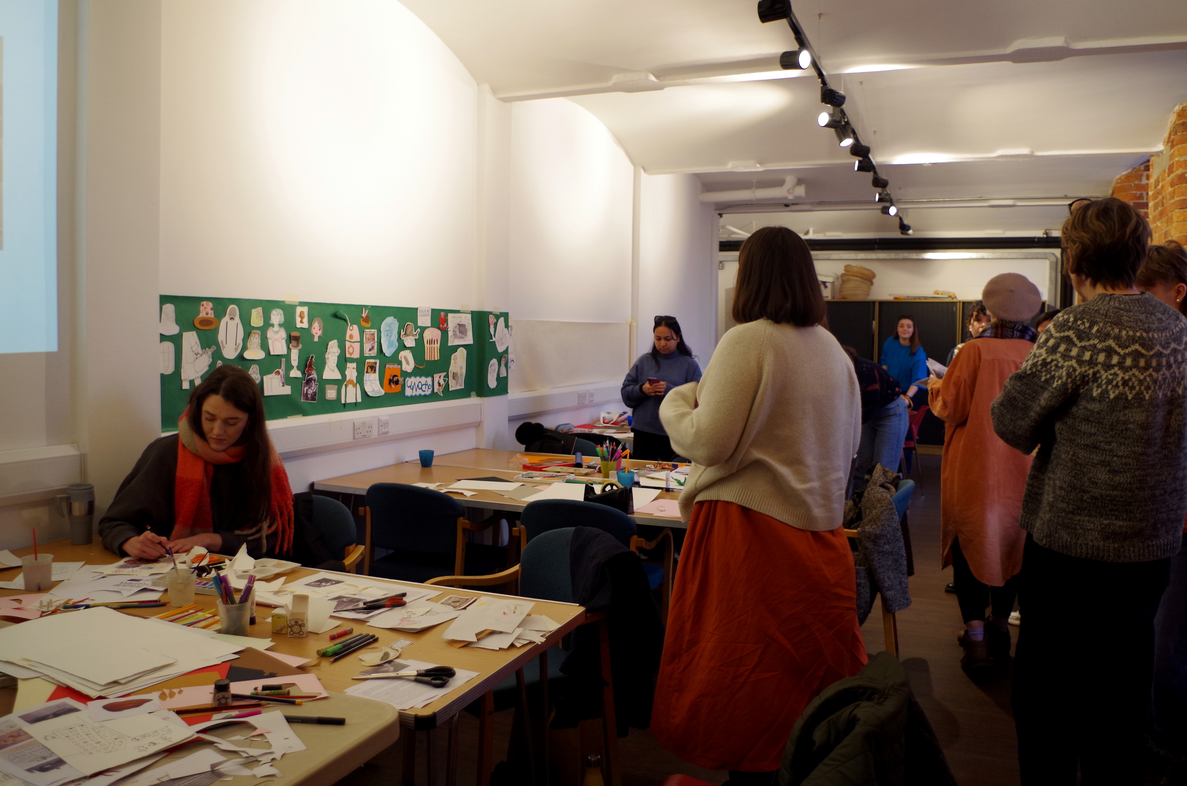 The workshop, aimed at budding illustrators with any level of experience, saw Maisy share her Elsie Plant animation for Hat Works’ Factory Floor gallery and how she uses both physical and digital archives as inspiration in her work. Maisy then used this approach to guide the group in a series of drawing prompts, illustrating other stories from within the museum’s archive.